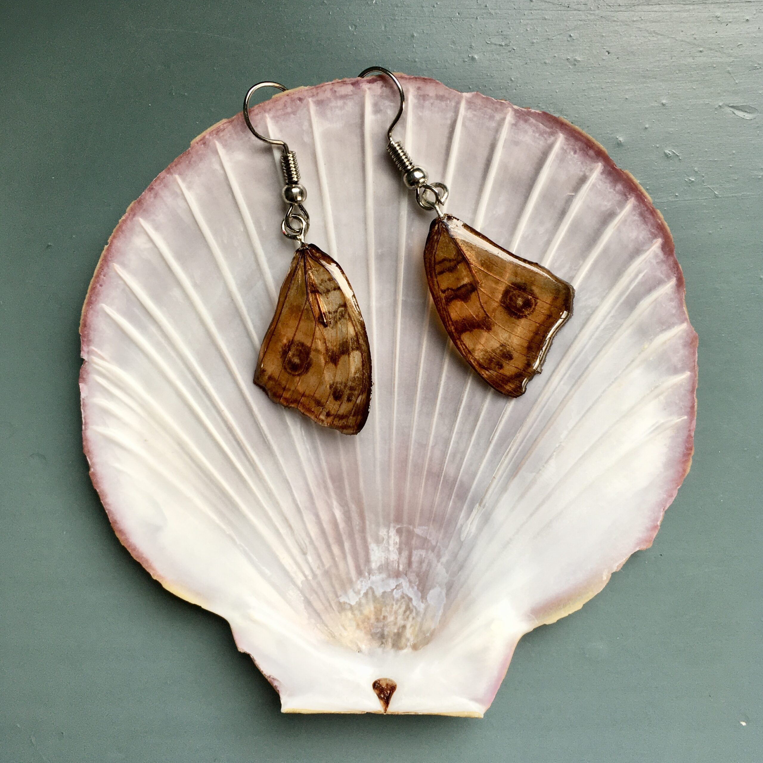 Handmade acrylic butterfly-wing earrings. The hooks are silver-plated and nickel free.