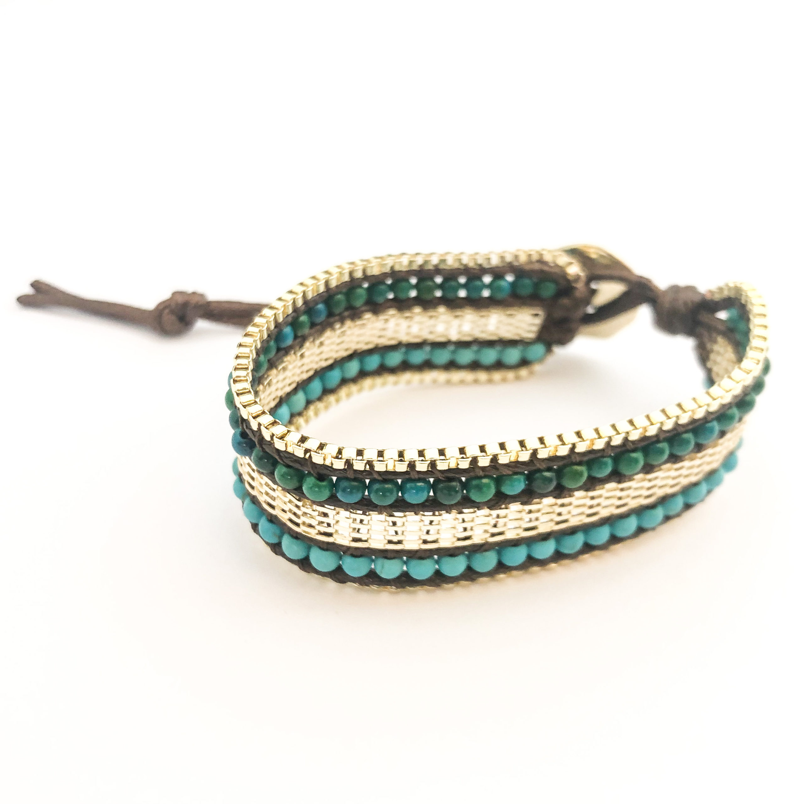 This beautiful handmade bracelet, is made of cord, brass and gemstones; howlite and chrysocolla. The bracelet is very comfortable and has 3 (adjustable) sizes, you close the bracelet with a nice button.