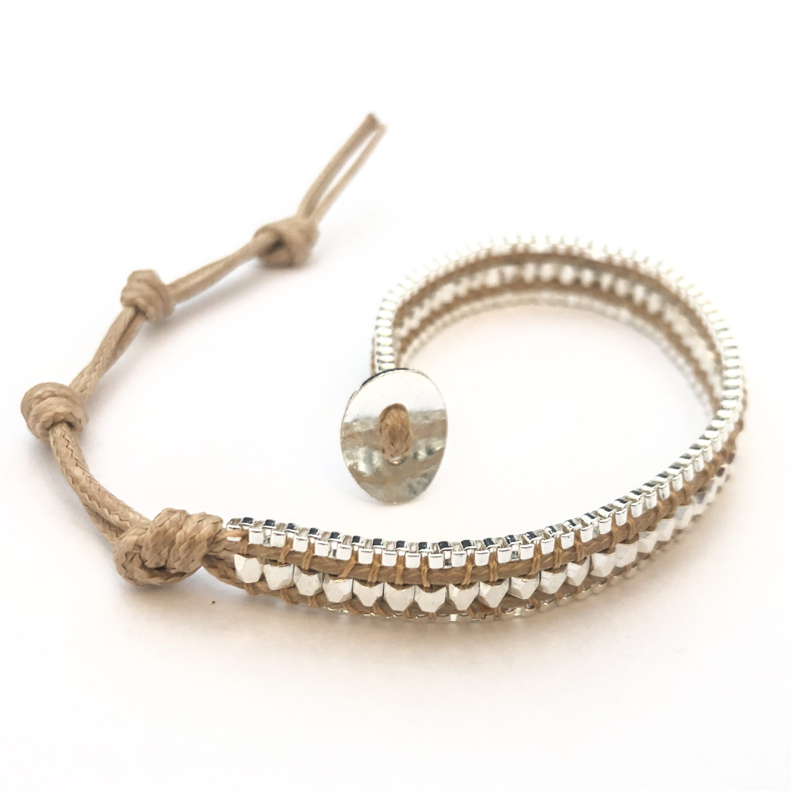 This bracelet is handmade and made of cord, brass and metallic beads. The bracelet is very comfortable and has 3 (adjustable) sizes, you close the bracelet with a nice button.