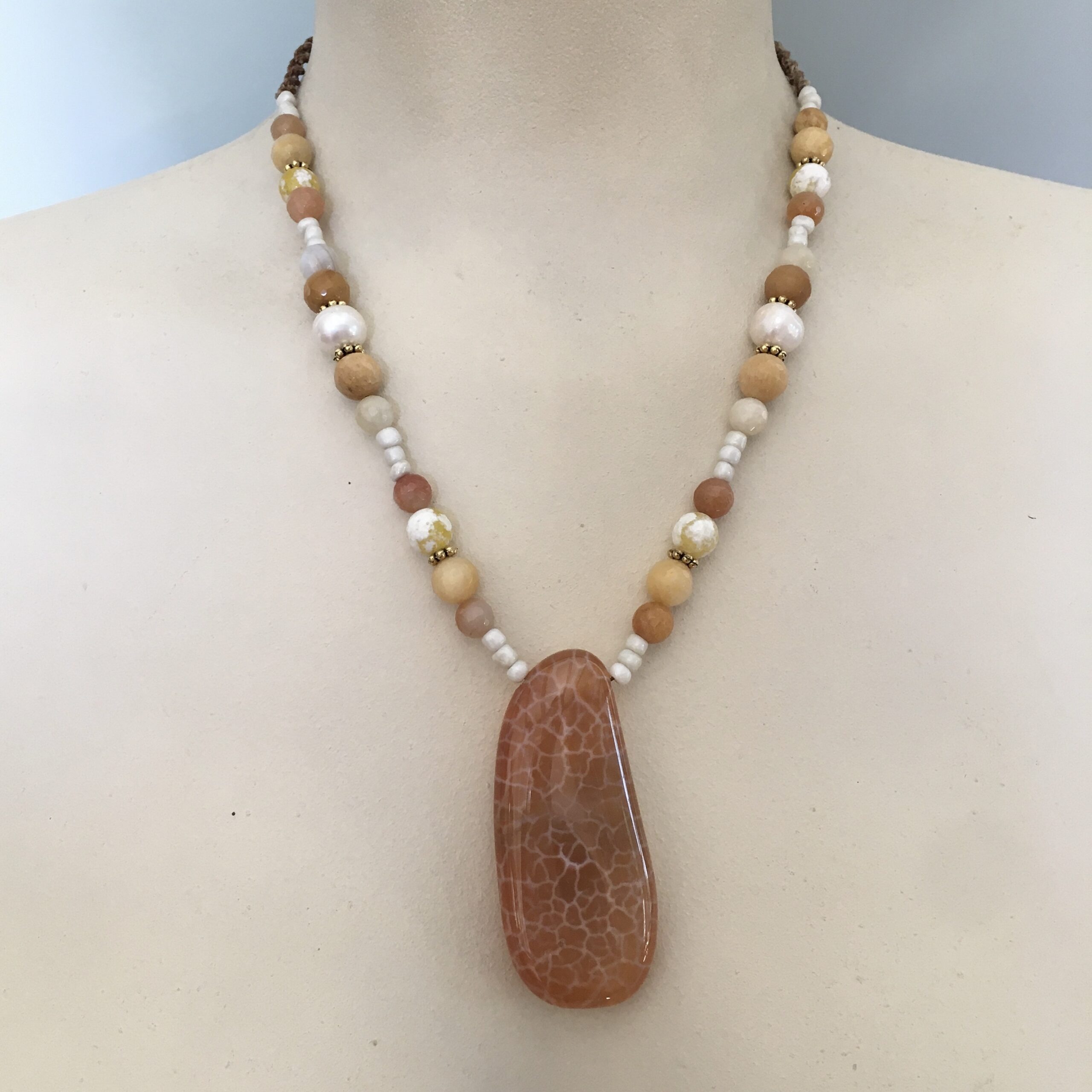 This necklace is unique and handmade with brown waxed rope. The pendant is a big agate with a beautiful natural design and is combined with pearls, agate and calcite.