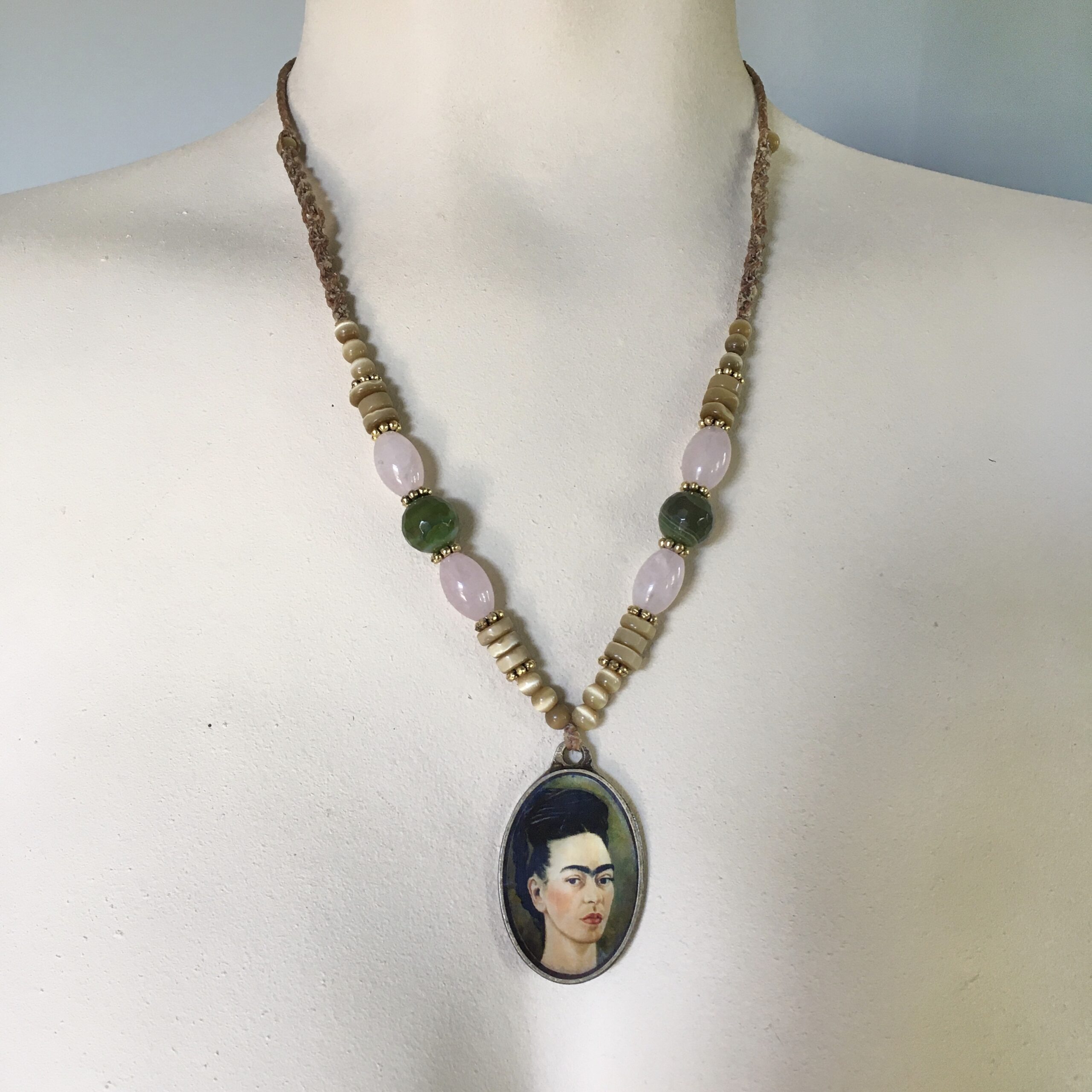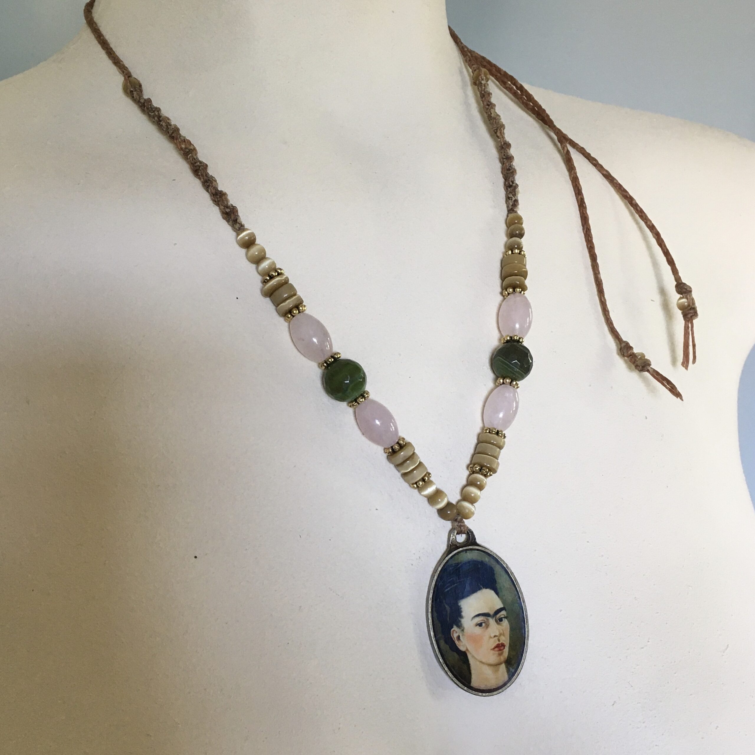 Beautiful handmade and unique necklace with a pendant of Frida. The necklace is made with waxed rope and different stones; rose quartz and cats eye The necklace can be knotted in various lengths.