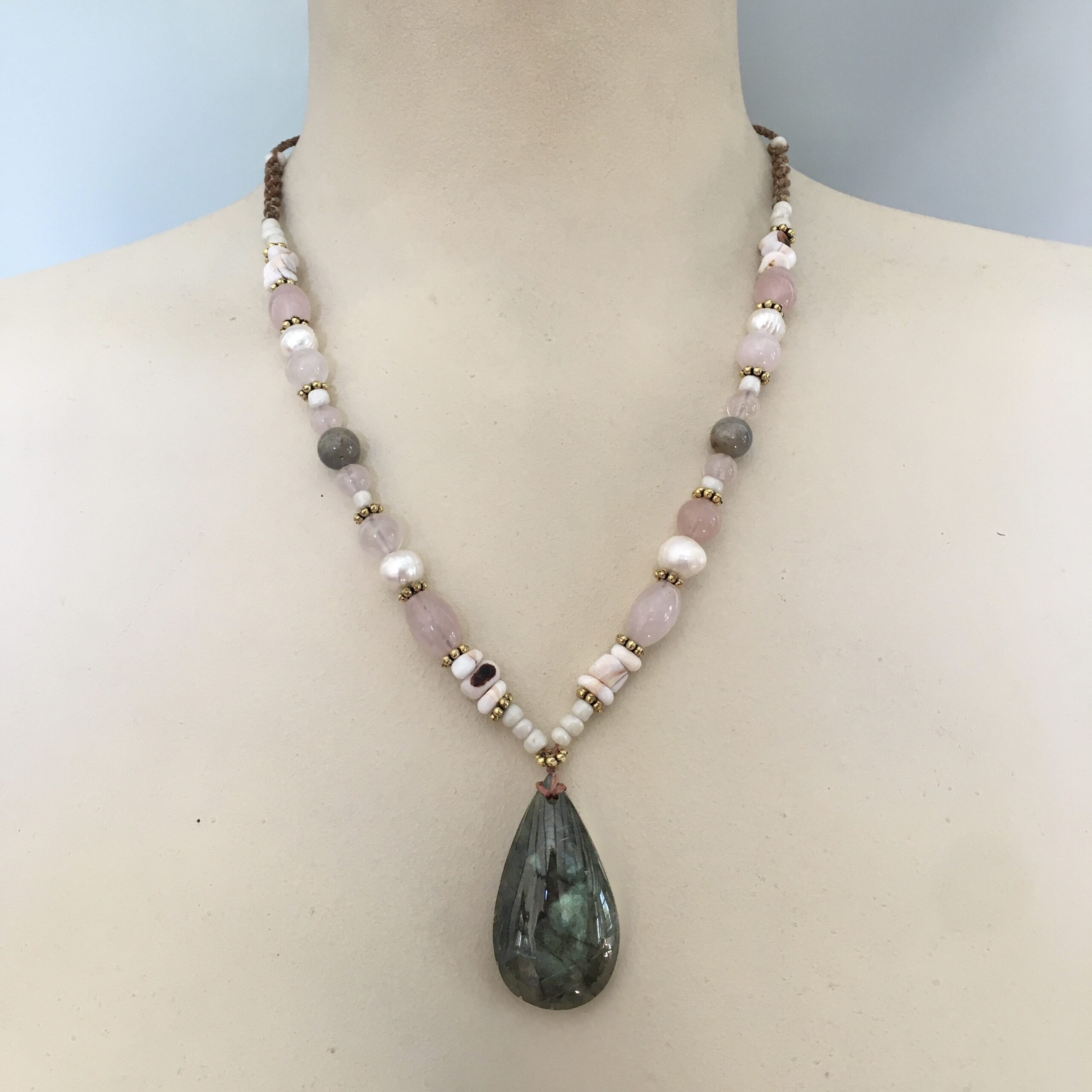 This necklace is unique and handmade with brown waxed rope. The pendant is a labradorite, and is combined with rose quartz, pearls, labradorite and puka shells.