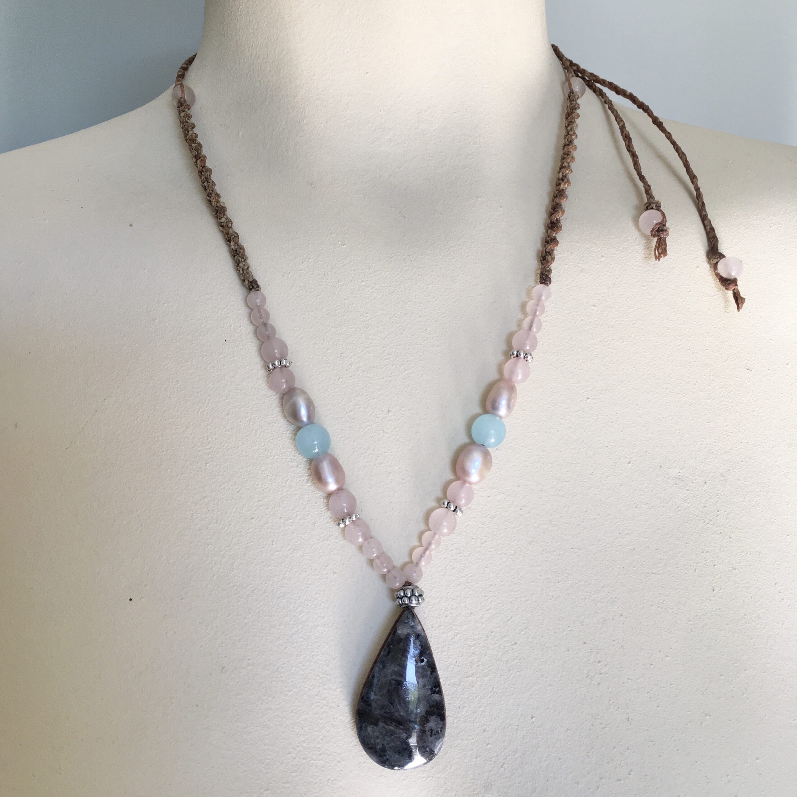 This necklace is unique and handmade with brown waxed rope. The pendant is labradorite, and is combined with rose quarts and pink pearls.