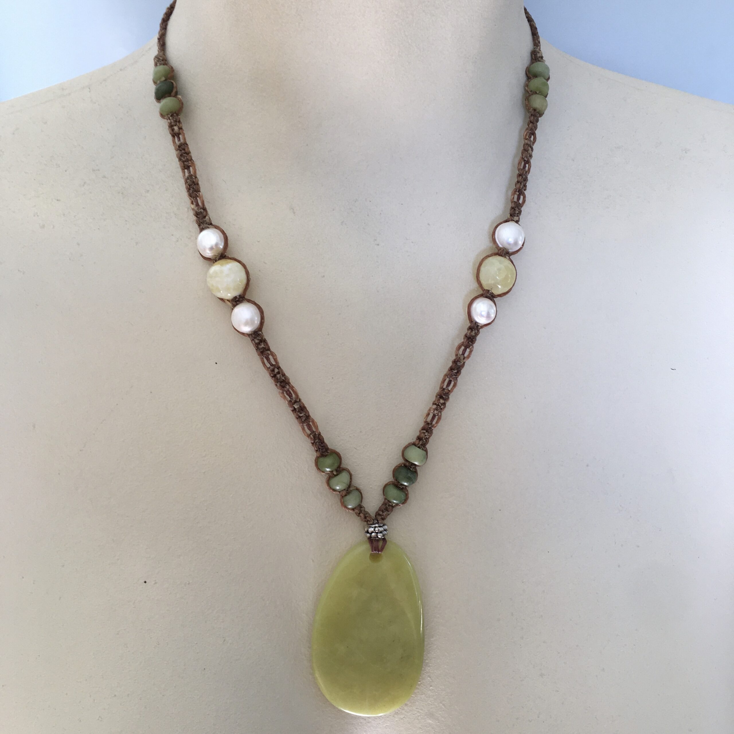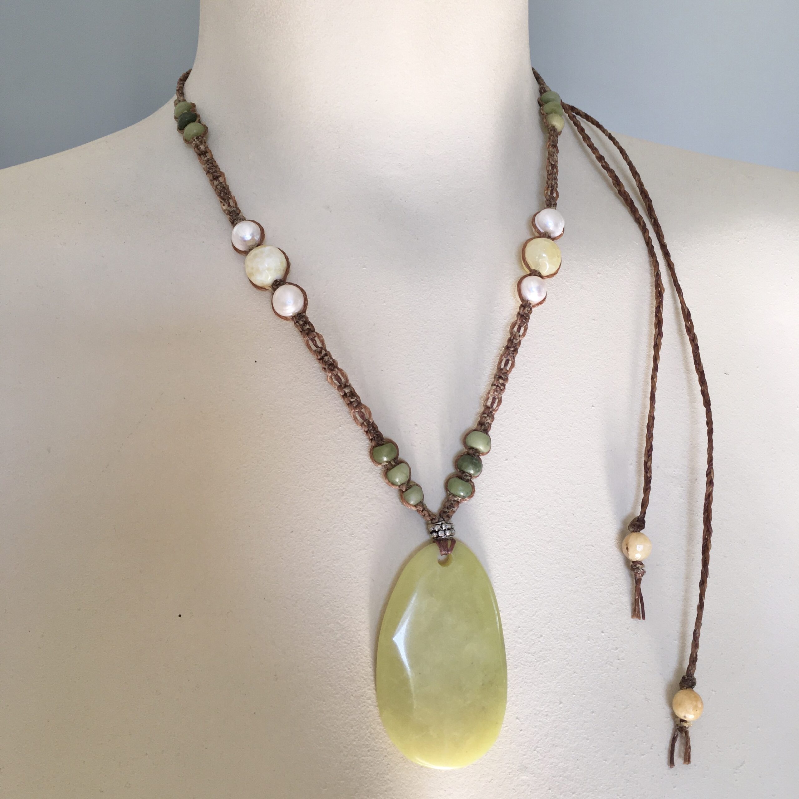 This necklace is unique and handmade with brown waxed rope. The pendant is a lemon jade, and is combined with agate, serpentine and pearls.
