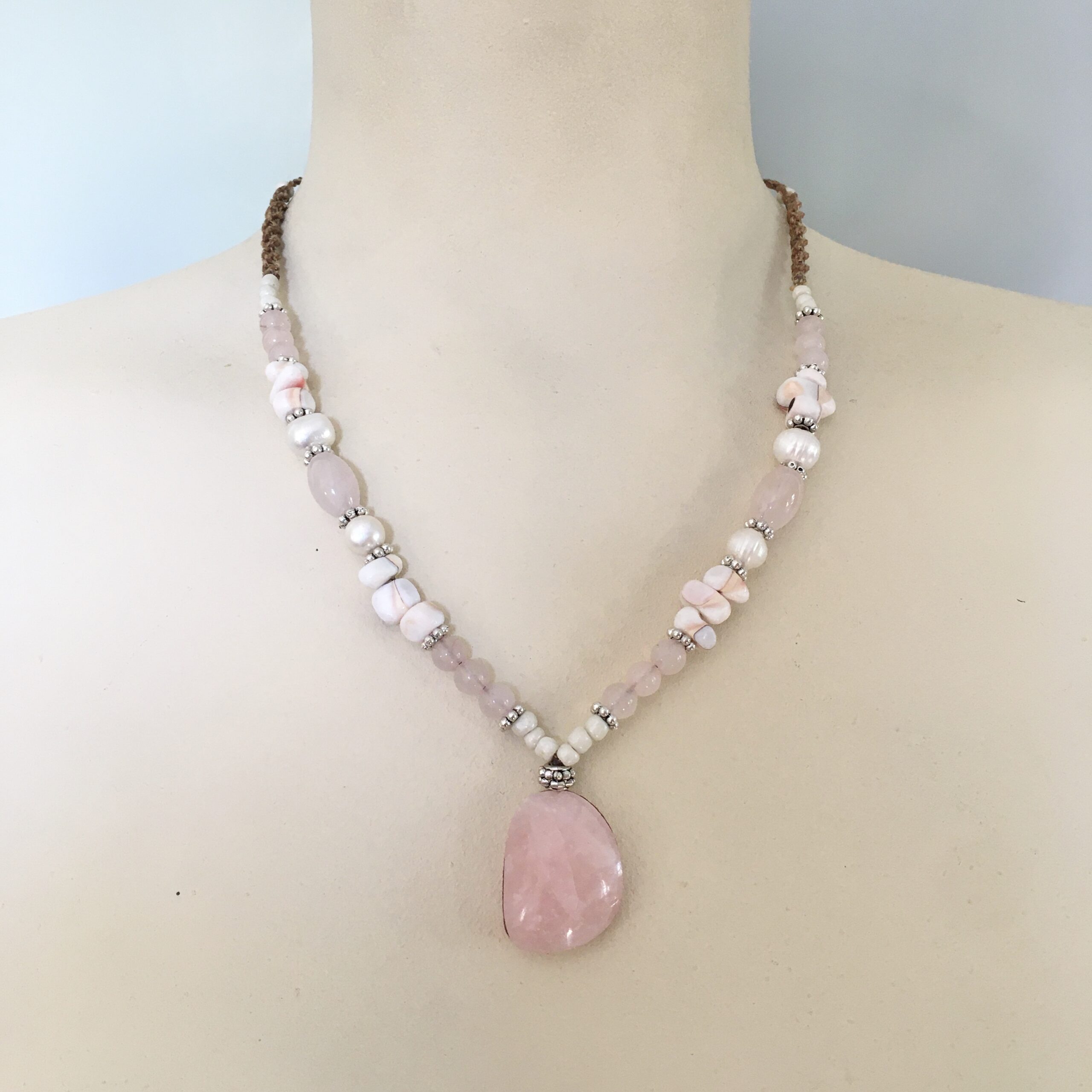 This necklace is unique and handmade with brown waxed rope. The pendant is rose quartz (the pendant stone has some small irregularities), and is combined with rose quartz, pearls, puka shells and white rocailles.
