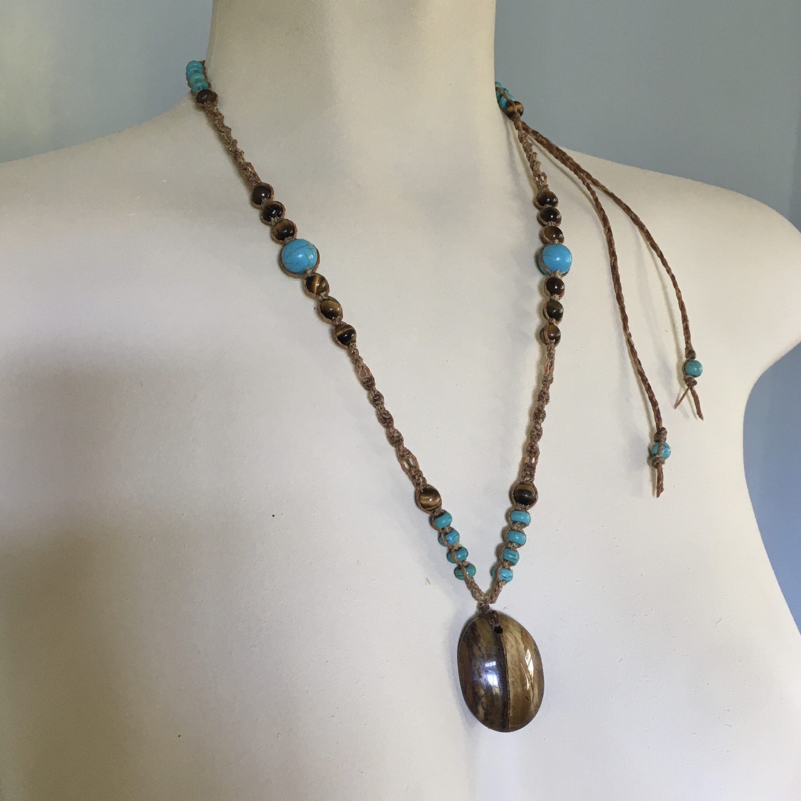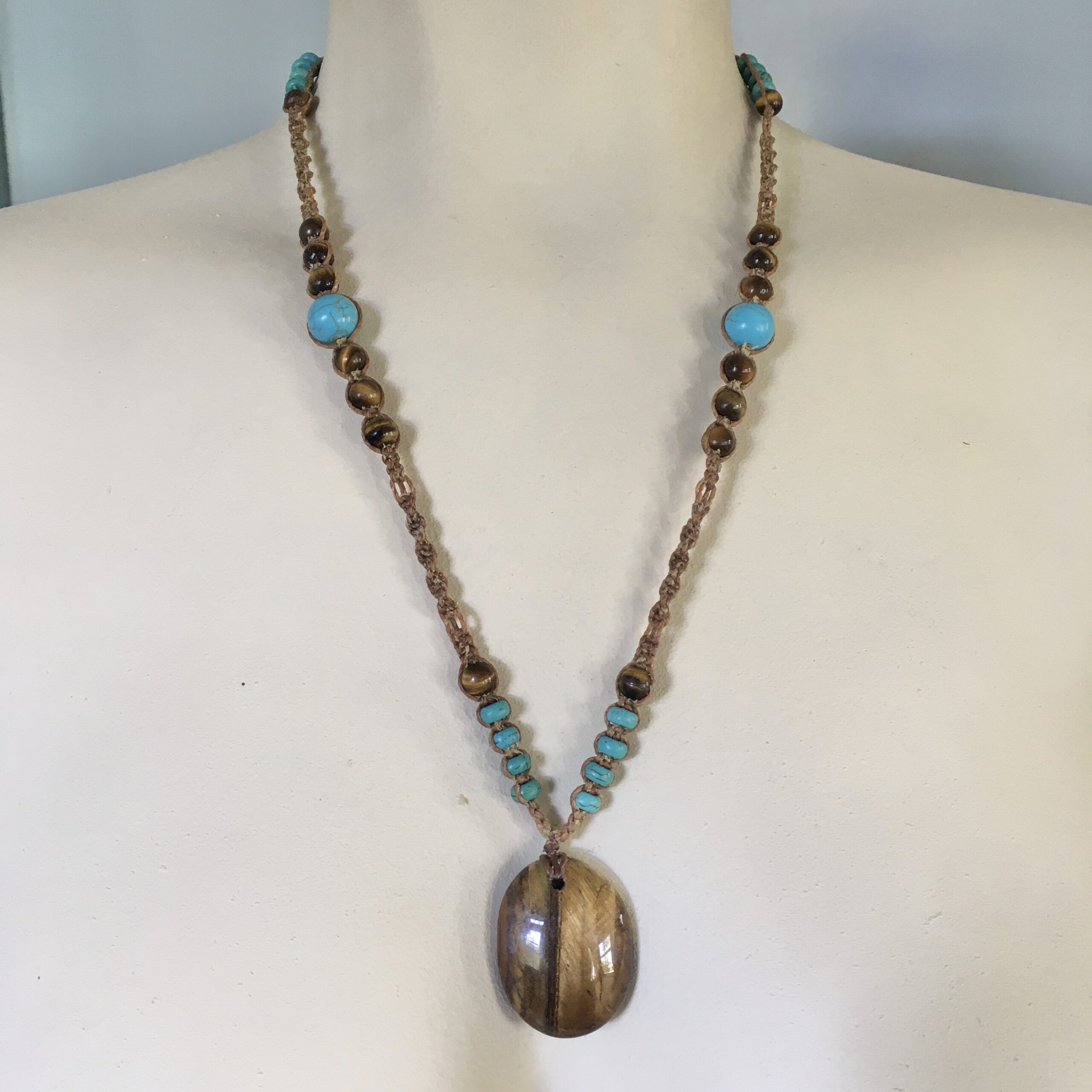 The pendant is made of tigers eye and is combined with stones: tigers eye and turquoise howlite.