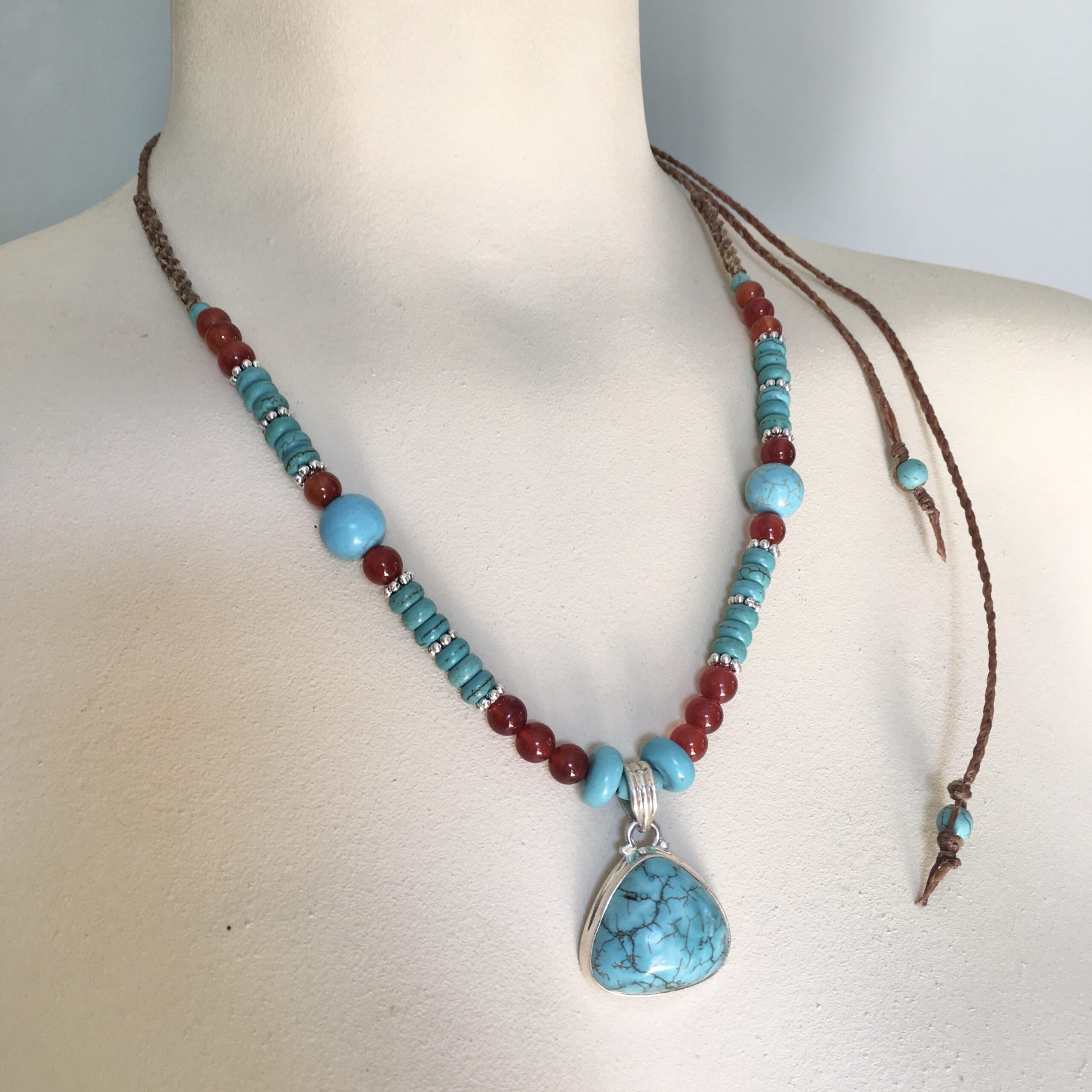 This necklace is unique and handmade with brown waxed rope. The pendant is made from sterling silver and turquoise, and is combined with turquoise howlite and carnelian.